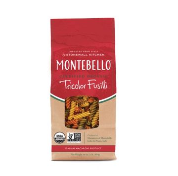 Corkscrew shaped pasta colored with organic spinach and tomatoes.
